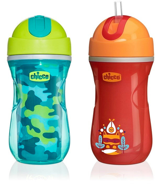 Cup for children from 18 months, ideal for use on the go, equipped with a sliding closure to keep the straw clean. Silicone straw, bite-resistant spout and insulated bottle that maintains the temperature of liquids. Equipped with an integrated anti-drip system.